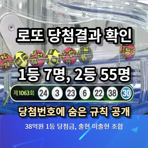 로또 1063 당첨번호, 로또 결과, 로또 1064 예상번호 분석을 소개하며, 이번 1063 로또에서는 1등 38억원 7명, 2등 55명 7900만원을 기록했다.