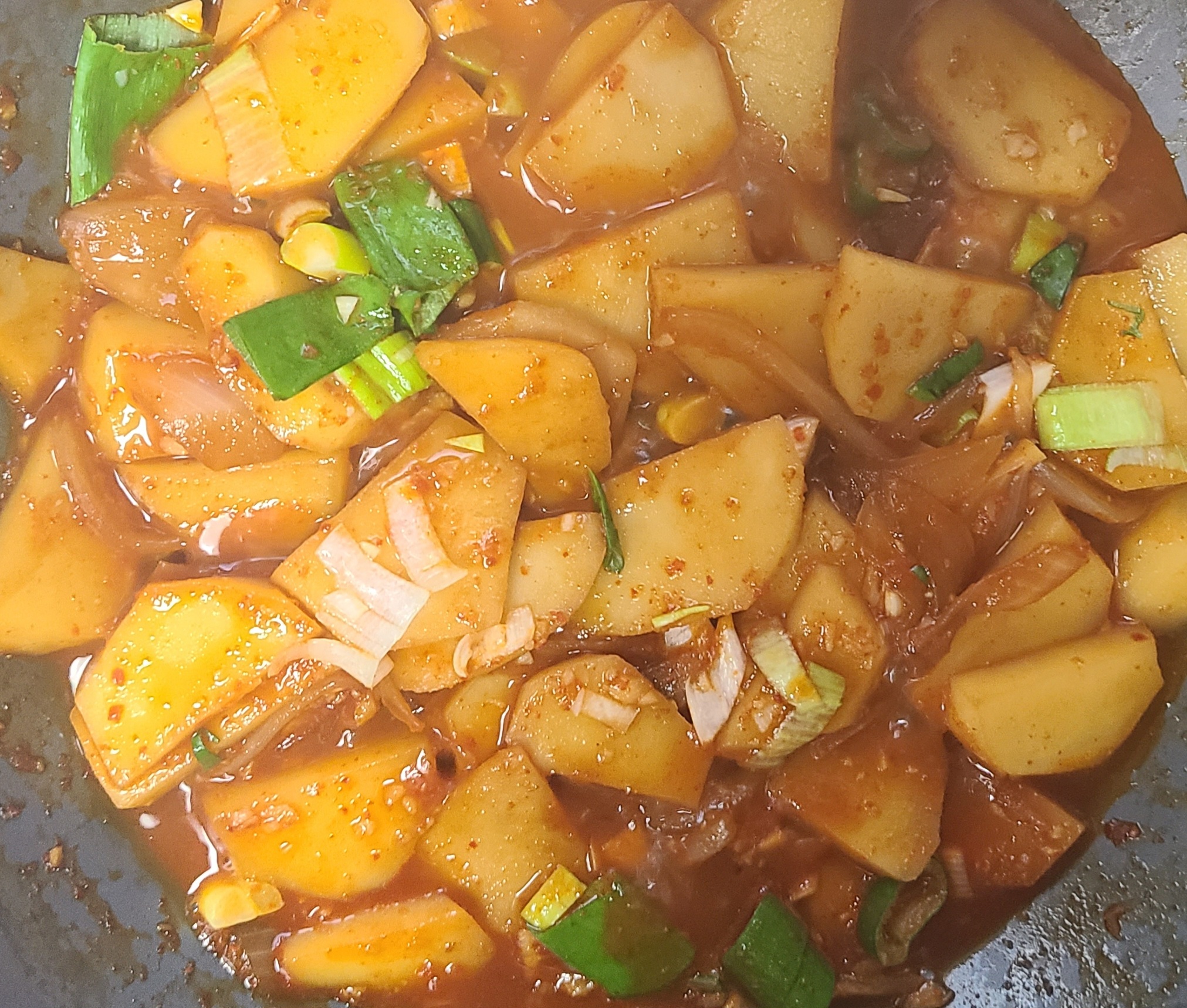 4. 준비한 물과 다진마늘을 넣고 뚜껑을 덮고 감자를 익혀주세요. 국물이 걸쭉해지면 초승달 모양의 감자 조각을 잘라 보세요. 부서지지 않고 조각조각 잘리면 완성입니다. (여전히 바삭하면 물을 조금 더 넣고 국물이 걸쭉해질 때까지 끓인다.)